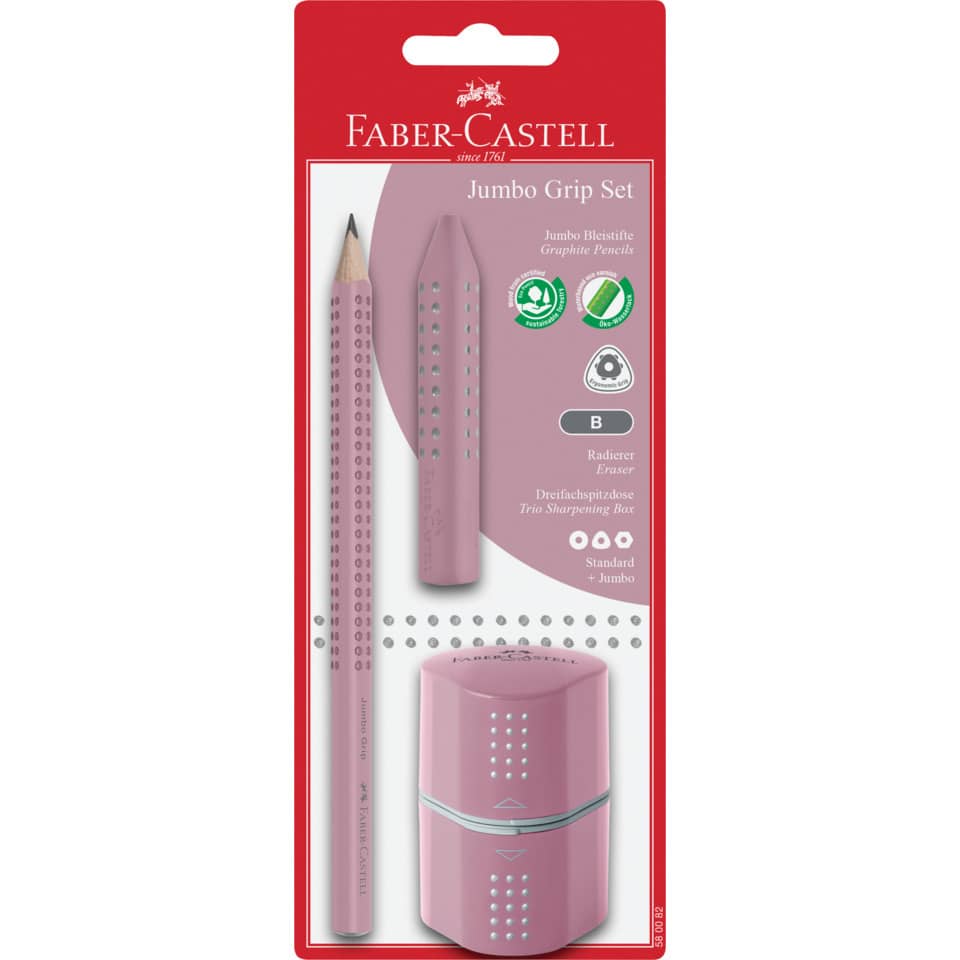 Bleistiftset Jumbo Grip. Ausführung der Schaftform: ergonomische Dreikantform. Gespitzt. Schaft lackiert. Lackierung auf Wasserbasis gegeben. Set mit Bleistift, Radierer und Dreifachspitzdose. Länge: 175 mm. Farbe des Schaftes: rose shadows. Bezeichnung der Härte: B. Ausführung des Inhalts mit Packung: auf Blisterkarte.