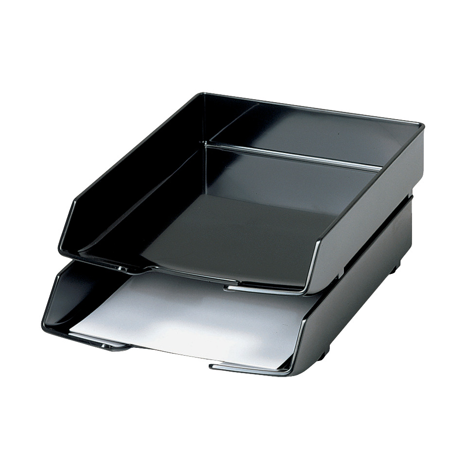 Briefablage WAVE. Ausführung: stapelbar, Greifausschnitt vorhanden. Modernes, harmonisches Design mit abgerundeten Ecken, samtweiche Gummifüßchen. Werkstoff: hochwertiger, schwermetallfreier Kunststoff. Verwendung für Papierformate: A4. Größe (B x H x T): 255 x 66 x 350 mm. Farbe: schwarz.