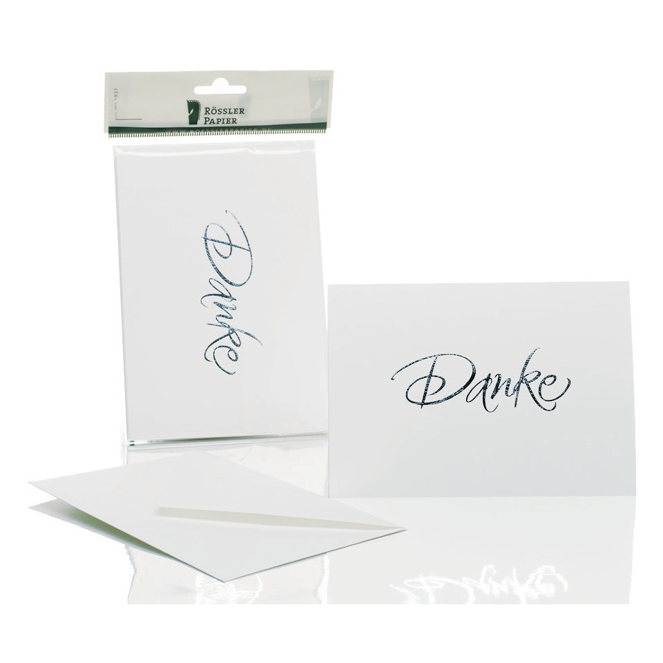 Die Karte mit dem gewissen Etwas. Sagen Sie Danke mit dieser hochwertigen Karte. Jede Karte ist mit Heißfolienprägung veredelt und trägt den Schriftzug „Danke“. 5 Stück B6 Karten im HD (hoch/doppelt) Format mit passendem Briefumschlag.
