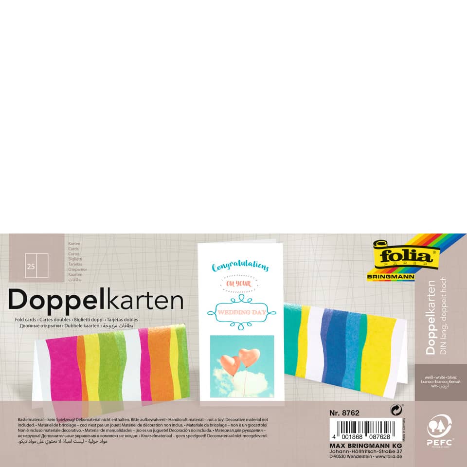 Blankokarten, DIN lang hoch, doppelt, 105 x 210 mm, Papierstärke 190 g/qm, Packungsinhalt: 25 Stück, Farbe: weiß.
