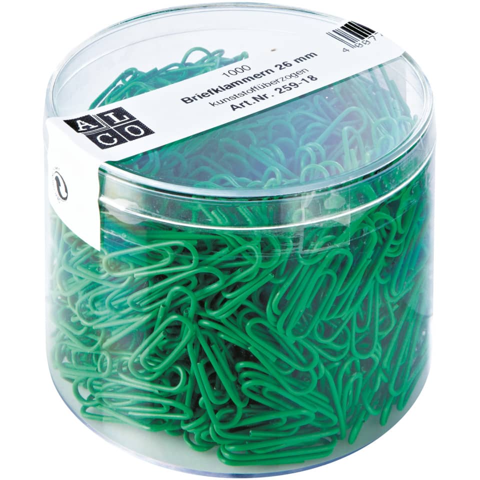 Briefklammer. Runde Form, Metall, kunststoffüberzogen. Länge: 26 mm. Farbe: grün. Packungsart/-inhalt: Dose 1000 Stück