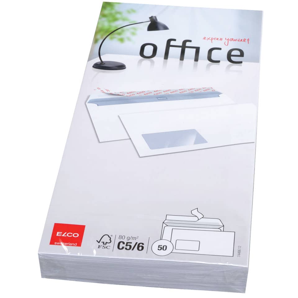Briefumschlag ELCO Office. Format C5/6. Farbe: Hochweiß. Umschlag-Verschluss: haftklebend. Mit Fenster links 90 x 45 mm. Papiergewicht: 80 g/qm. Mit grauem Innendruck. Packungsinhalt: 50 Stück. Rohstoff zur Herstellung aus verantwortungsvoller, nachhaltiger Forstwirtschaft.