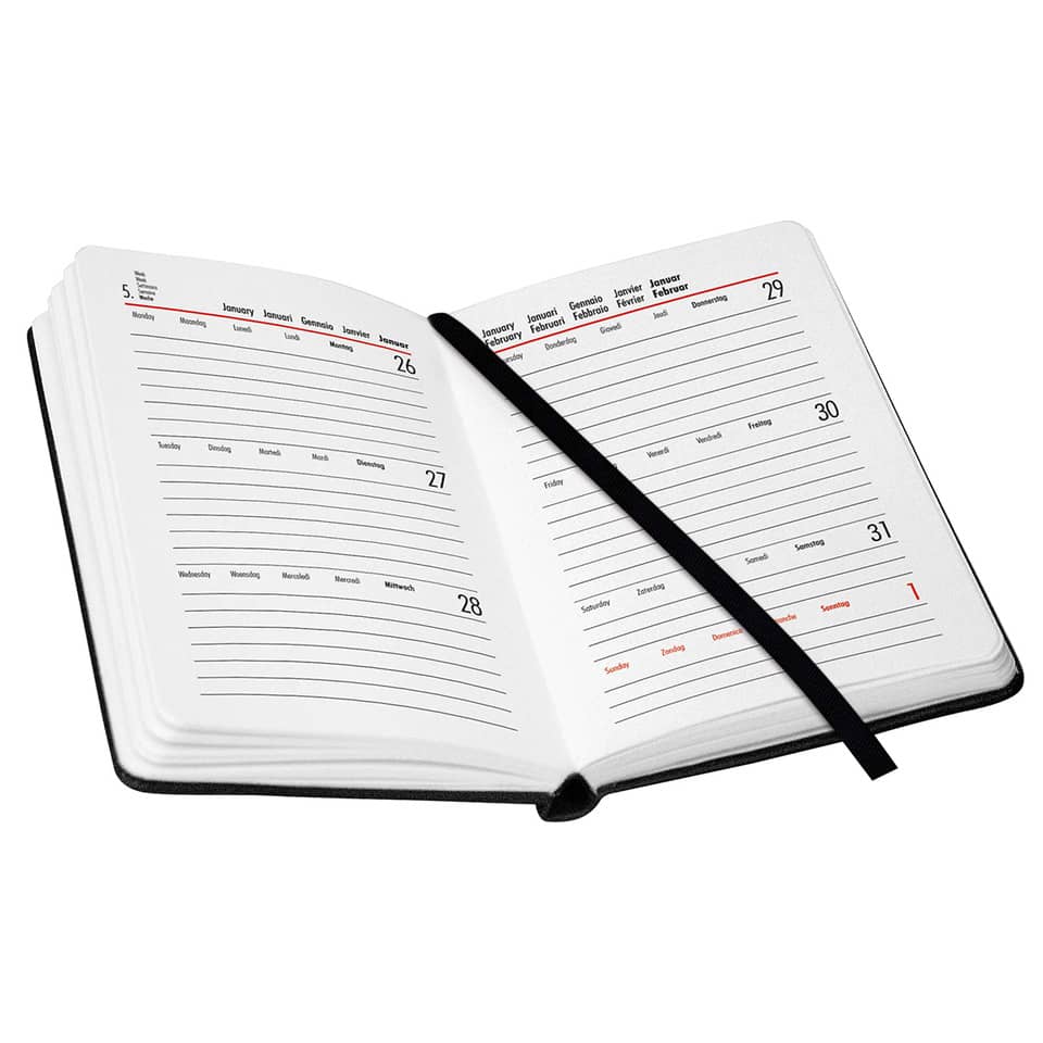 BSB V-Book Buchkalender A6 mit Gummiband – schwarz. Format geschlossen: ca. 9 x 14 cm. Einband mit Jahreszahlprägung, weiches Kunstleder mit Gummiband. Kalender, 1 Woche / 2 Seiten mit Infoseiten. 57 Blatt Kalender und 39 Blatt Notizen.