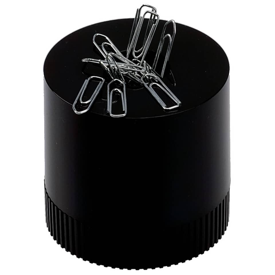arlac Klammernspender – Nachfüllbar durch abnehmbaren Boden. Bestückung: gefüllt. Material: Kunststoff. Eigenschaft: magnetisch. Form: rund. Ø x H: 70 x 70 mm. Farbe: schwarz.