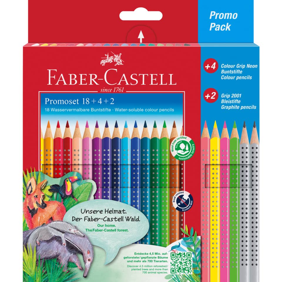 Promotionset Colour Grip 18+4+2. inkl. Colour Grip neon und Bleistifte. Ausführung Mine: Bezeichnung der Härte: keine. Stärke der Mine: 3,8, Schreibfarbe der Mine: sortiert, wasservermalbar. Ausführung Schaft: Schaft lackiert. Ausführung der Schaftform: ergonomische Dreikantform, Lackierung auf Wasserbasis gegeben, Farbe des Schaftes: sortiert. Material des Schaftes: Holz. Größe Stift (Ø x L): Durchmesser: 6 mm, Länge: 175 mm. Art der Verpackung und Inhalt: Ausführung der Lieferzusammenstellung: Set