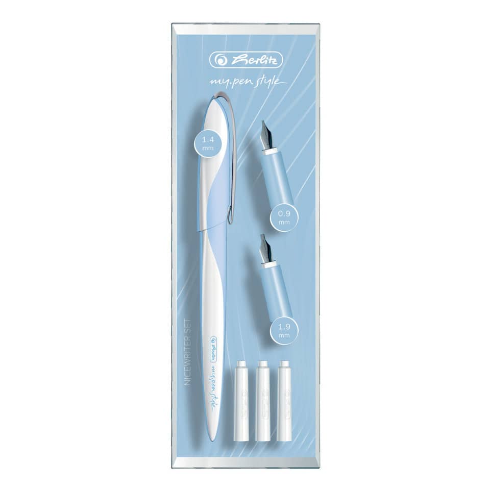 Füllhalter in geschwungener Form, mit elegantem Kiel der optimale Stift zum Schönschreiben Set besteht aus 3 Griffstücken mit hochwertigen my.pen Federn in den Stärken 0,9 1,4 1,9 sowohl für Links- als auch für Rechtshänder geeignet nachfüllbar mit Standard- und Universaltintenpatronen Erstklassiges Tintenleitsystem verhindert Kleckse und Eintrocknen verpackt im Folienetui Ausführung der Feder: Metall. Anzahl der Schreibgeräte: 1. Farbe: light blue.