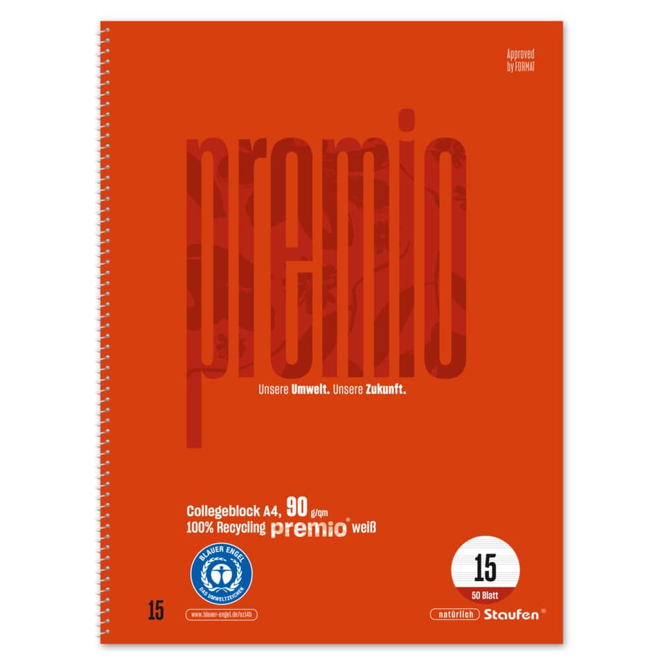 Collegeblock Original. Spiralbindung. Lochung: 4fach. Mikro-Perforation. Ausführung des Papiertyps: holzfrei. Flächenmasse des Papiers: 90 g/qm. Extra starkes Schreibpapier. Papierformat: A4. Notenlineatur. Farbe: weiß. Anzahl der Blätter: 50 Blatt. Qualität mit dem Umwelt-Extra! Das exklusive premio® Sortiment wird aus 100% recycletem Papier unter den strengen Auflagen des Blauen Engels und des EU Ecolabels hergestellt. Die erstklassige Beschaffenheit und das hochweiße 90 Gramm Papier sorgen für ein angenehmes Schreibgefühl und eine herausragende Opazität. Geschützt wird jedes Produkt durch Deckblätter bzw. Umschläge mit hoher Grammatur, im eleganten Design der modernen permio® Farbenwelt. premio® ist DER umweltfreundliche Begleiter in Schule und Büro.