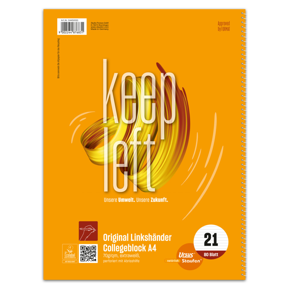 URSUS Style Motiv Collegeblöcke für Linkshänder, Spirale auf der rechten Seite im Format A4 80 Blatt 70g hochweißes ECF Papier. Lineatur Nr. 21 9 mm liniert ohne Rahmen. Zertifiziert mit dem EU Ecolabel. Blätter perforiert und 4-fach gelocht mit abgerundeten Ecken auf den 2 linken Seiten.