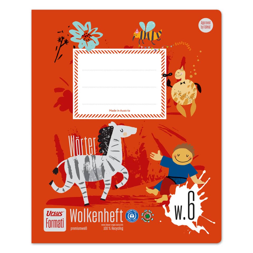 Formati Schulprodukte werden aus hochwertigem Pure Impact Recyclingpapier hergestellt, sind mit dem Österreichischen Umweltzeichen und dem Blauen Engel ausgezeichnet, Formati – hilft dir in der Schule, Wortschatz vergrößern, Sprache erleben: Abgerundete Ecken und eingerückter Zeilenblock mit Farbrand, Linke Seite mit zwei Wolkenfeldern bestehend aus einer Hauptwolke und 10 kleinen Wolken, rechte Seite zwei Felder 10 mm liniert, Optimal für Wortschatz- und Grammatikübungen sowie für Satz- und Geschichtenbildung, Format Quart 195 x 240 mm