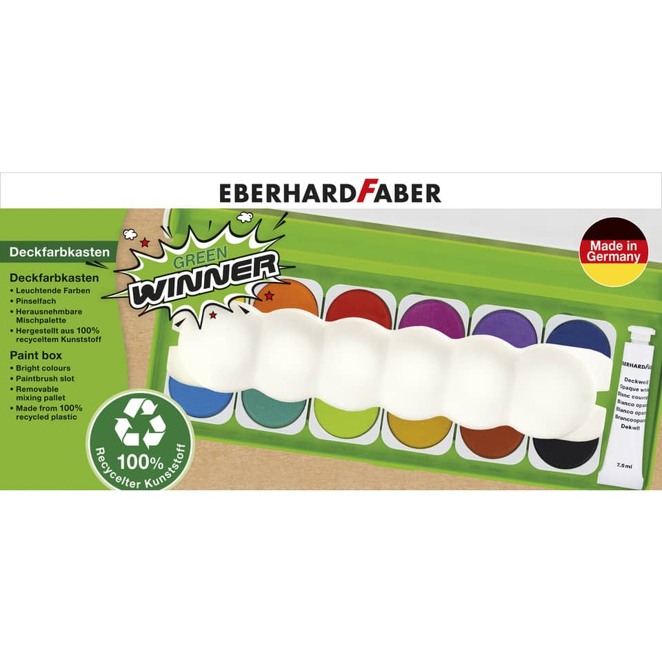 Deckfarbkasten 12er Green Winner. Ausführung: Kunststoffbox aus 100% recyceltem Material. Anzahl der Farben: 12 Stück. Farbe: gelb, orange, zinnoberrot, magentarot, violett, ultramarinblau, cyanblau, blaugrün, gelbgrün, ockergelb, sienna gebrannt, schwarz.