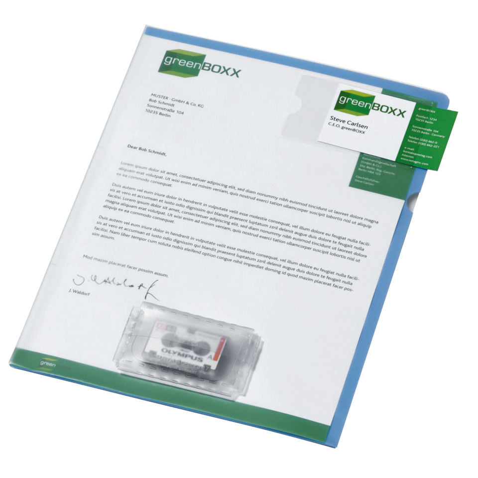 DURABLE Diktathülle, blau. Mit Tasche für alle handelsüblichen Diktatkassetten und Beschriftungsfenster im Visitenkartenformat 90 x 57 mm auf dem Vorderdeckel. Transparenter Vorder- und farbiger Rückendeckel.