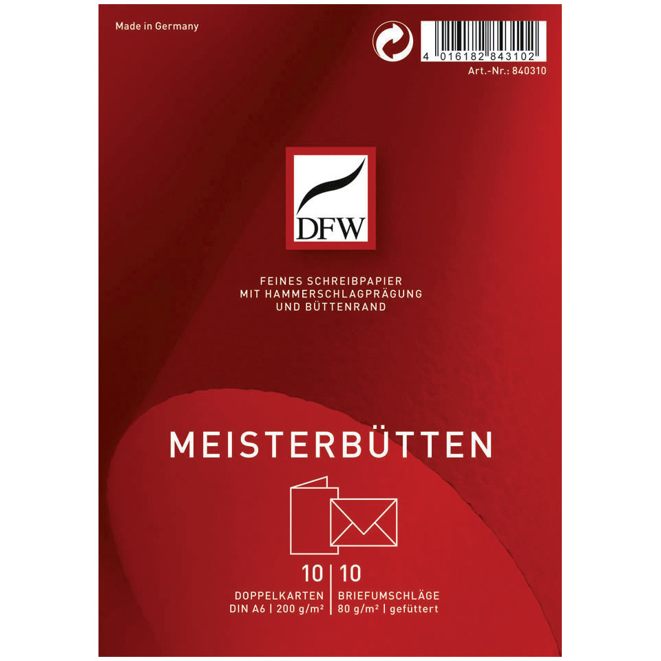 DFW Meisterbütten – industriell gefertigtes Büttenpapier mit gehämmerter Oberfläche, und klassischem Wellenschnittrand. Ein Schreibpapier für den konservativen Briefeschreiber, das alle Anforderungen einer edlen Schreibpapierserie erfüllt.