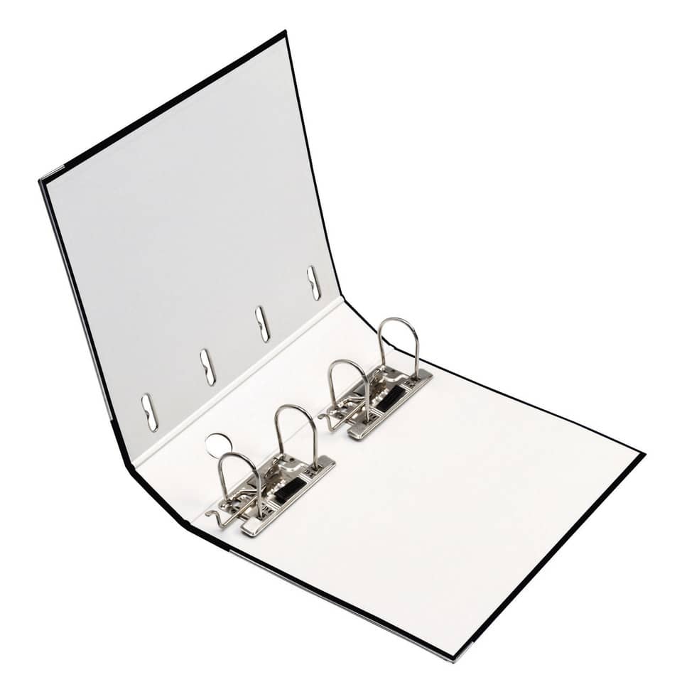Doppelordner. Material der Kaschierung außen: griffig genarbte PP-Folie. Grauer Innenspiegel. Ausführung: mit Sichttasche am Rücken. Qualitätshebelmechanik, Griffloch, Schlitze und Kantenschutz vorhanden. Verwendung für Papierformate: 2 x DIN A5 quer. Rückenbreite: 70 mm. Farbe: schwarz.