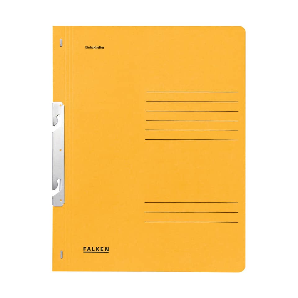 Einhakhefter A4 1/1 Vorderdeckel. Art der Heftung: kaufmännische Heftung. Ausstattung: ganz, Abheftvorrichtung vorhanden, Organisationsaufdruck vorhanden. Werkstoff: Manilakarton. Papiergewicht bzw Stärke: 250 g/qm. Verwendung für Papierformate: A4. Größe (B x H): 240 x 305 mm. Farbe: Gelb. Blauer Engel.