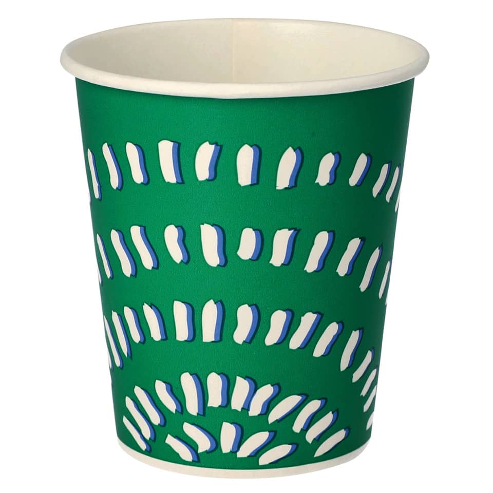 Grüner Pappbecher für Kaltgetränke. Innen und außen mit PE-Beschichtung. Durchmesser 8 cm, Höhe 8,8cm, mit Füllstrich, Füllinhalt 0,2l.