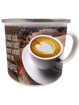 Emailletasse mit Henkel: Kaffee redet nicht, Kaffee jammert nicht, Kaffee macht einfach seinen Job. Ich mag Kaffee. Emaillebecher Ich mag Kaffee