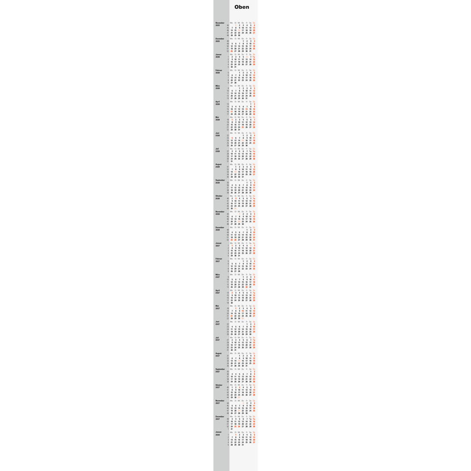 Das Ersatzkalendarium 2026/27 Modell Sequenz ist passend für Tischkalender Artikel-Nr. 7038000 und dient als praktischer Jahreswechsel-Einsatz. Mit einer Blattgröße von 9,4 × 132 cm (94 × 1320 mm) bietet es eine klare 3-Monats-Übersicht für das Kalenderjahr 2026 und 2027. Das Kalendarium ist in schwarz/rot gedruckt und überzeugt durch seine gute Lesbarkeit und strukturierte Darstellung.Ideal als Nachrüstlösung für bestehende Kalendermodelle, ermöglicht das Ersatzkalendarium eine einfache Aktualisierung ohne den kompletten Kalender austauschen zu müssen.