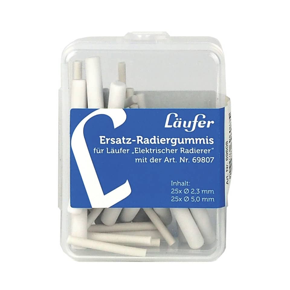 Wiederverschließbare Dose enthält je 25x Radiergummi Ø 2,3 mm und 25x Radiergummi Ø 5,0mm. Ersatzradiergummis aus Kunststoff für den elektrischen Läufer-Radierer 69607.