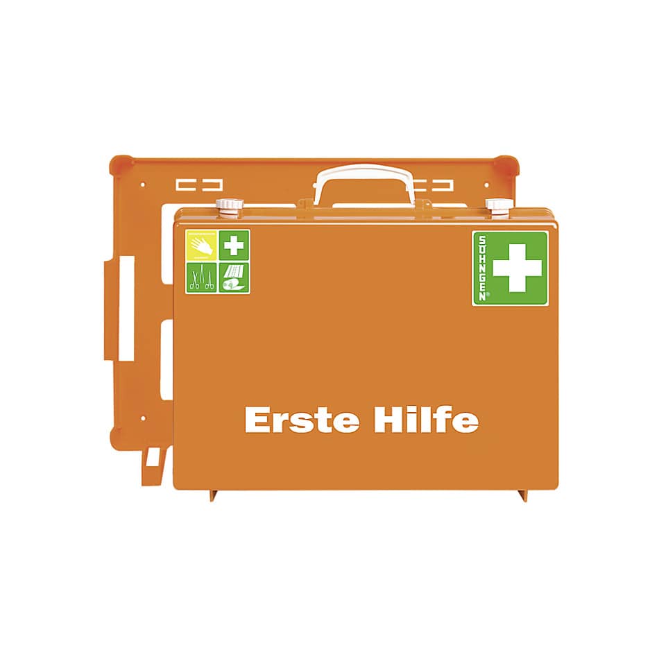 Erste-Hilfe-Koffer MT-CD Industrie Norm orange. Erste-Hilfe-Koffer mit viel Platz und hochwertiger SÖHNGEN®-Füllung. Inhalt: DIN 13169, SÖHNGEN®-Markenverbandstoffe, überwiegend aluderm®-, aluderm®-aluplast-Verbandstoffe. Maße: ca. 400 x 300 x 150 mm. Farbe: orange.