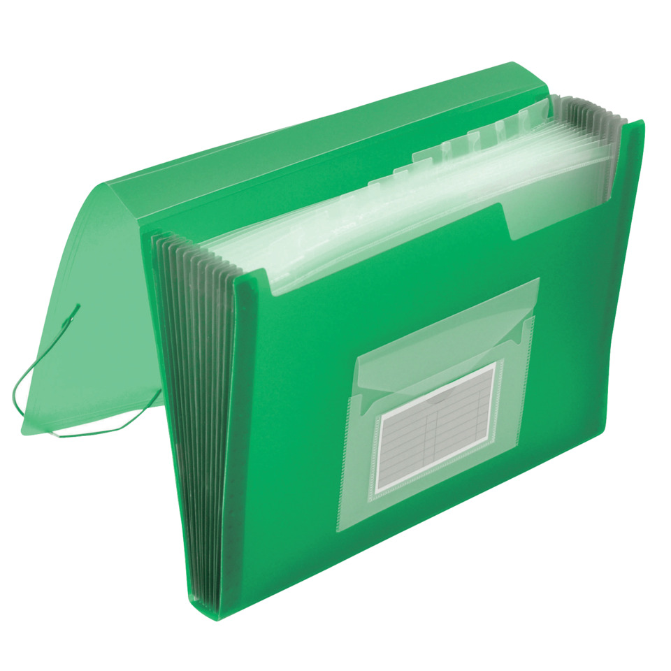 Fächermappe aus Polypropylen (PP). Mit 12 Taben = 13 Taschen. Zwei Einschubfächer an der Frontseite, Beschriftungsstreifen sind eingelegt. Gummizug über zwei Ecken. Fassungsvermögen ca. 250 Blatt (80 g/qm).