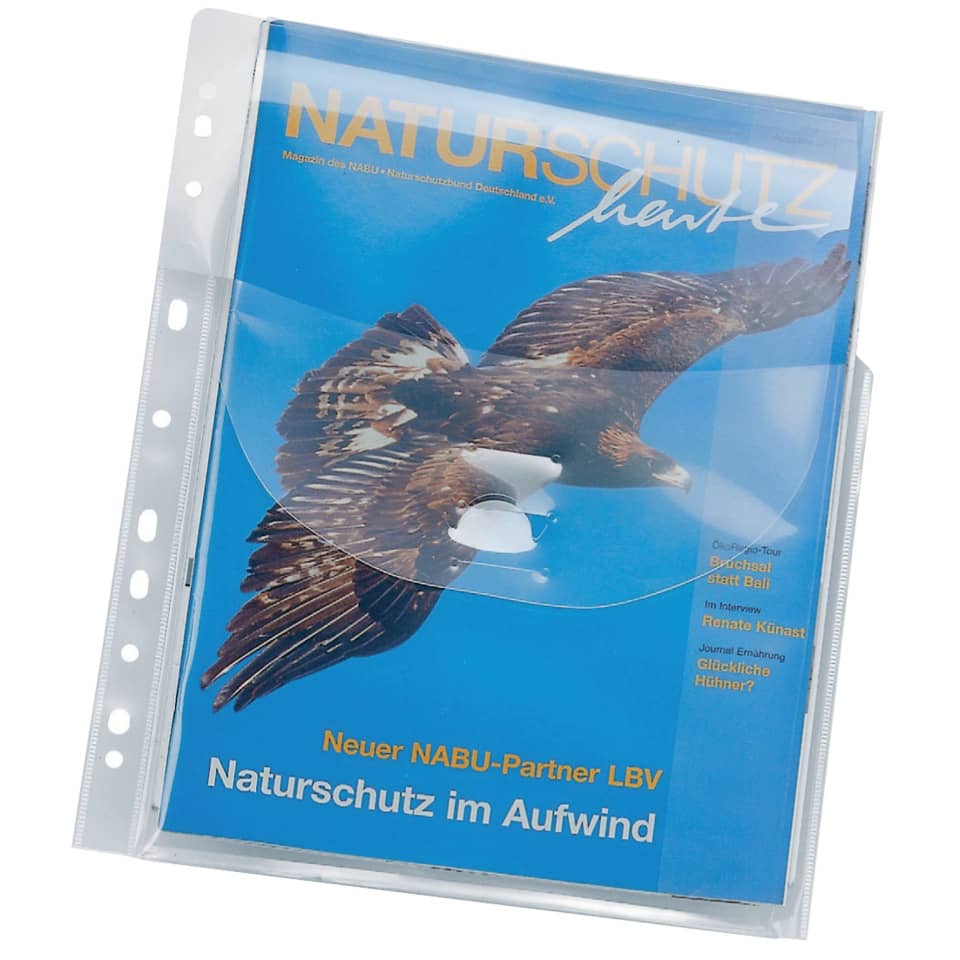 Jumbo-Faltentasche, Hüllen strapazierfähig, dokumentenecht, Lochrandverstärkung vorhanden. Faltentasche, mit Verschlussklappe oben offen, EURO-Lochung. A4. WPP. Glänzend. Stärke: 0,2 mm. Nachfolger von 4320000.