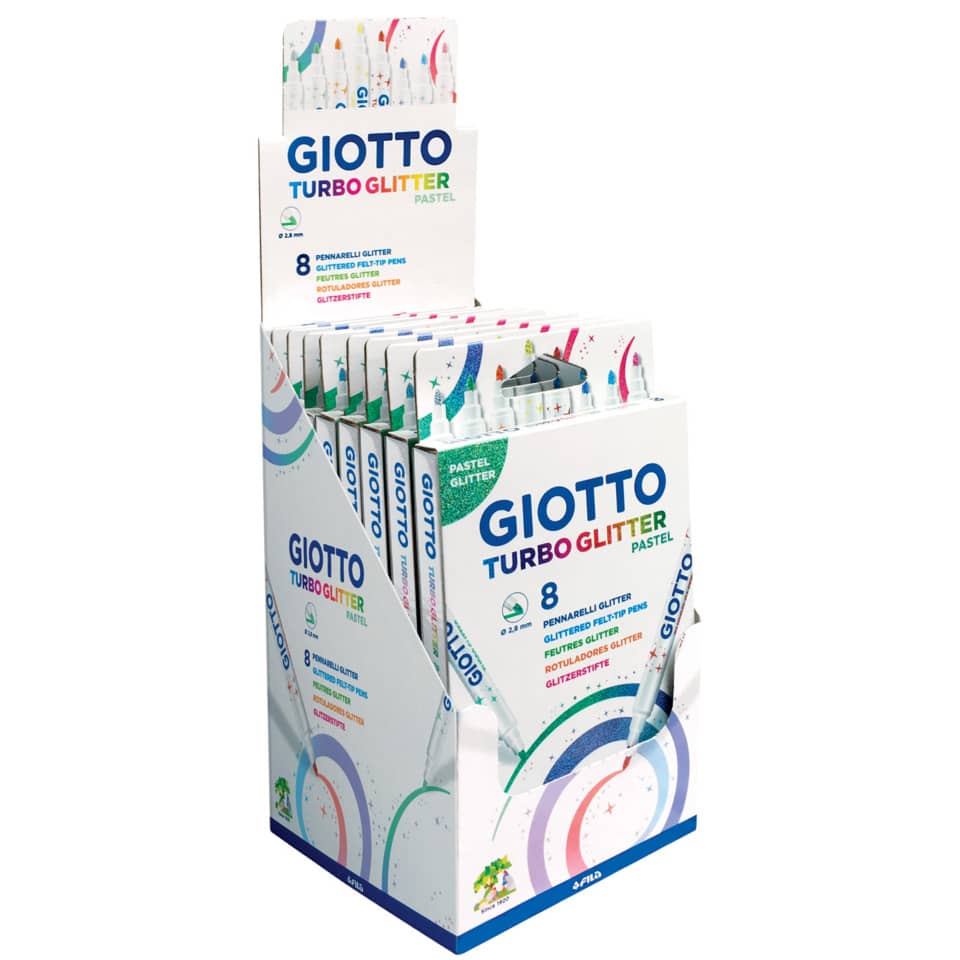 GIOTTO Turbo Glitter Pastel 8er Etui, farbig sortiert. Fasermaler mit spezieller Glitzerfarbe in 8 verschieden Pastellfarben. Ventilierte Kappe, drucksichere Spitze, die ihre Form behält Sicherheitsverschluss. Unbedenkliche Tinte auf Wasserbasis, von Händen und in der Waschmaschine bei 40° C auswaschbar. Stiftlänge: 15 cm (inkl. Verschlusskappe).