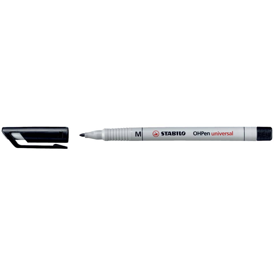 STABILO® OHPen universal. Folienstift für alle, die ihre Ideen vor anderen Menschen erläutern möchten. Schreibt auf fast allen glatten Oberflächen. Schwarzer Schaft für permanente Tinte, grauer Schaft für wasserlösliche Tinte. Rutschfeste Griffzone und praktischer Clip. Bis zu 72 Stunden Austrocknungsschutz ohne Kappe. Kappe am Stiftende aufsteckbar.
