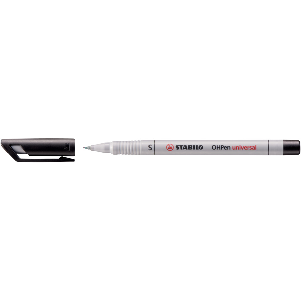 STABILO® OHPen universal. Folienstift für alle, die ihre Ideen vor anderen Menschen erläutern möchten. Schreibt auf fast allen glatten Oberflächen. Schwarzer Schaft für permanente Tinte, grauer Schaft für wasserlösliche Tinte. Rutschfeste Griffzone und praktischer Clip. Bis zu 72 Stunden Austrocknungsschutz ohne Kappe. Kappe am Stiftende aufsteckbar.