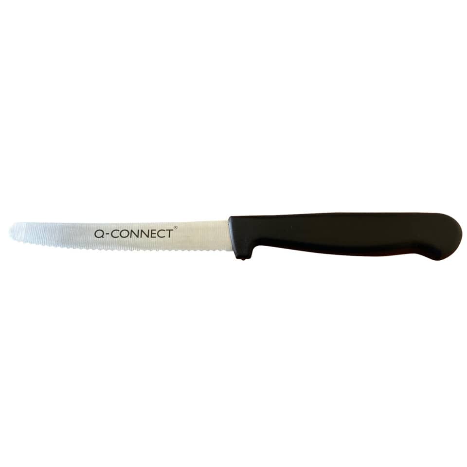 Frühstücksmesser mit Kunststoffgriff in schwarz. Klinge aus Edelstahl, ca. 10 cm mit Wellenschliff 4mm auspoliert, runde Spitze und Klingenschutz transparent. Gesamtlänge 21cm.