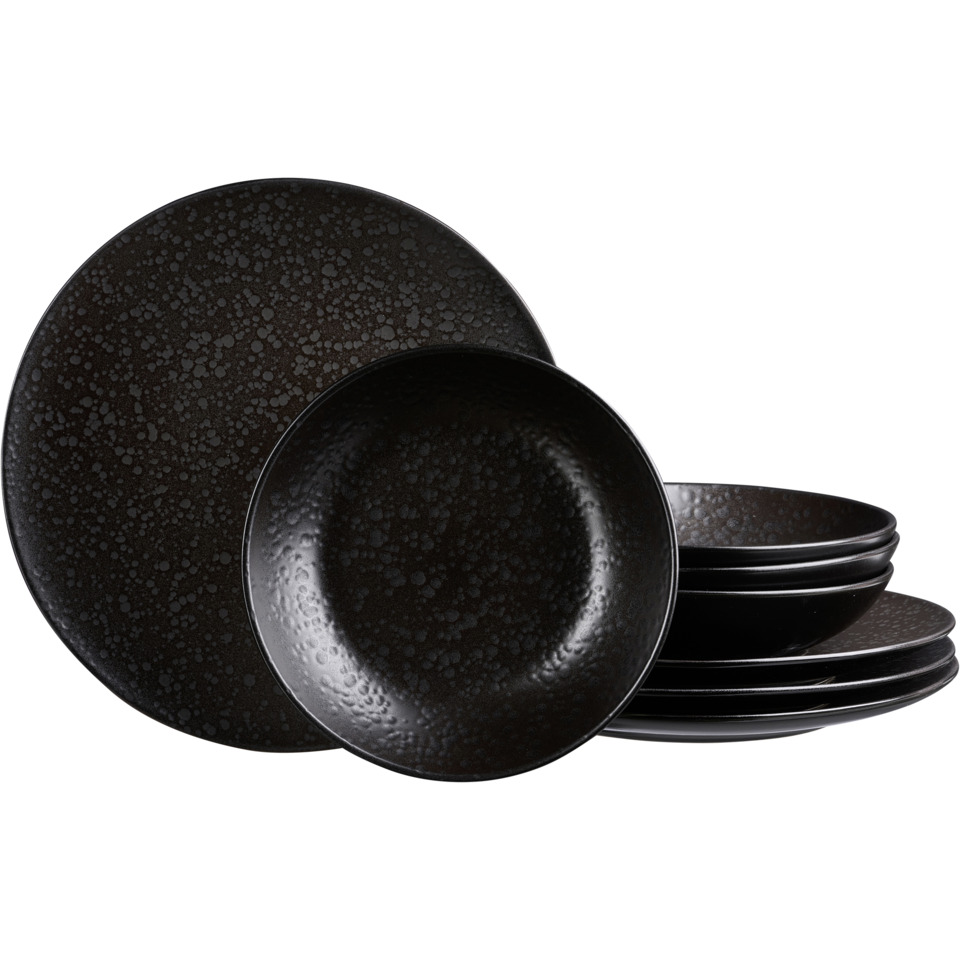 Smart & stylish: Beim kitwe Service fasziniert die Kombination aus Flächen mit gemasertem und solchen mit glattem Finish. Die Maserung, die sich während des Brennvorgangs auf Basis einer sogenannten Reaktivglasur individuell entwickelt, macht jedes Geschirrteil zu einem Unikat. Dank der Coupeform und dem seidenmatten Schwarzton punktet kitwe ganz nebenbei als zeitgemäßes Gourmet-Geschirr. Inhalt: 4 Becher 370ml Kitwe schwarz, 4 Müslischale 14cm Kitwe schwarz, 4 Dessertteller 20cm Kitwe schwarz. Praktisch im Alltag, beeindruckend bei besonderen Anlässen und selbstverständlich spülmaschinen- sowie mikrowellengeeignet.