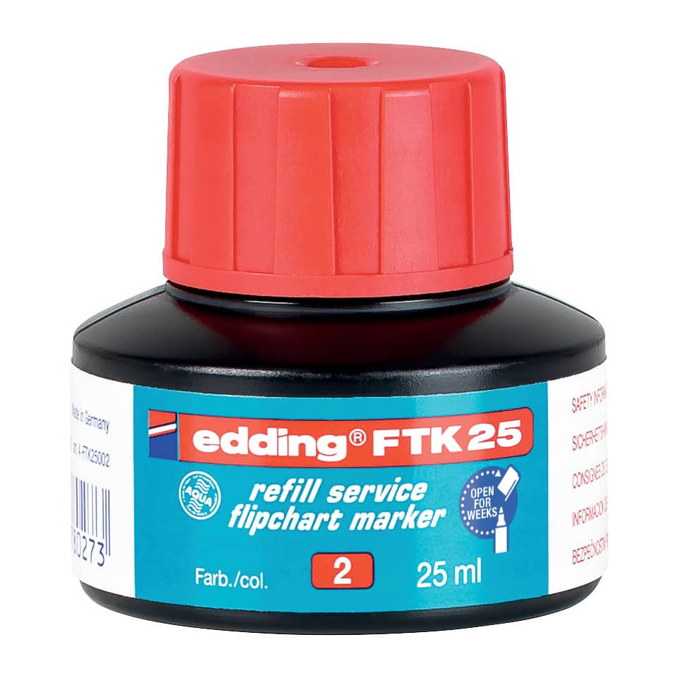 Nachfülltusche edding FTK 25 refill service flipchart marker. Zum Nachfüllen der Flipchartmarker edding 380, 383. Geruchsneutrale, lichtbeständige Tusche auf Wasserbasis in einer Flasche mit Kapillarsystem. Marker einfach mit der Spitze nach unten in die Refillflasche stellen, nach wenigen Minuten ist der Marker wieder schreibbereit. Inhalt: 25 ml. Farbe: rot.