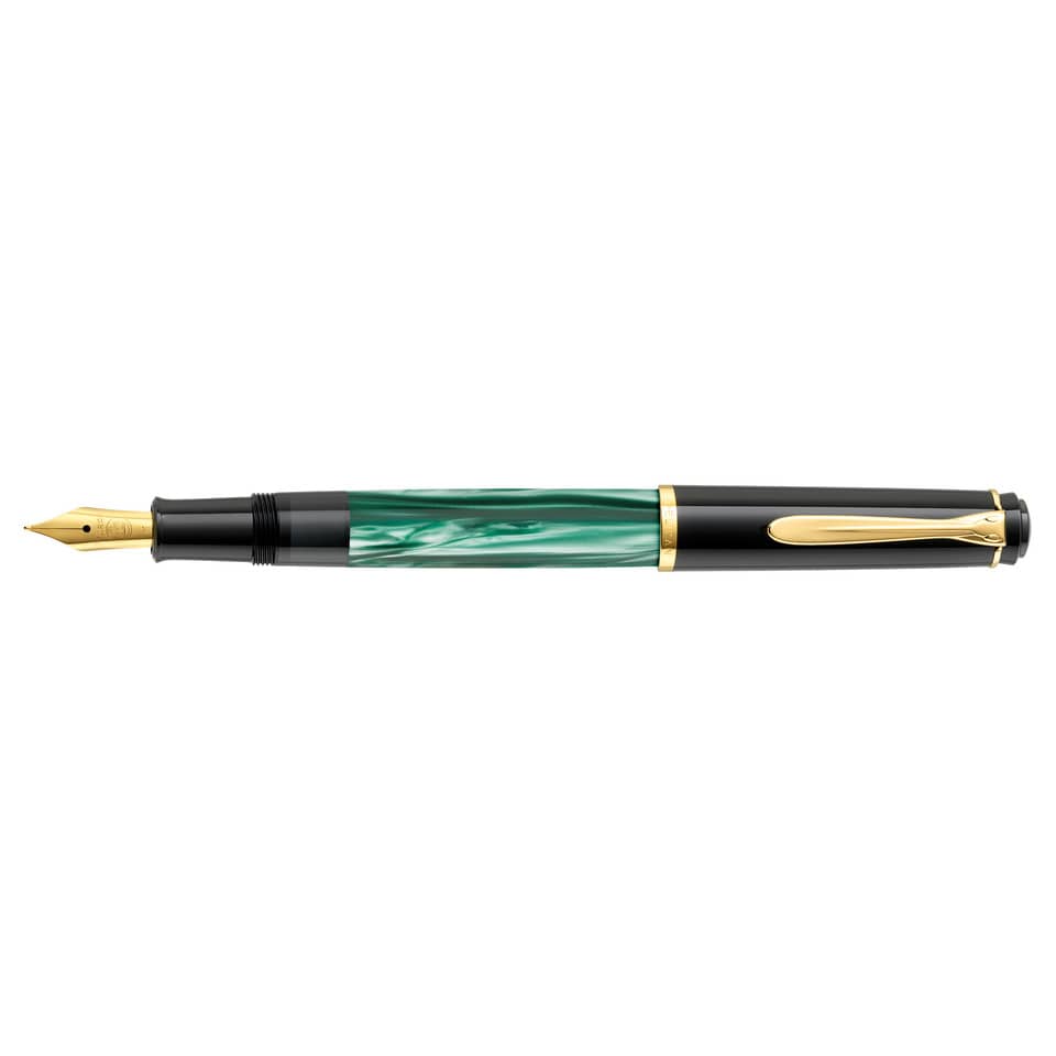 Pelikan Kolbenfüllhalter Classic M200 Grün-Marmoriert im Etui. Schreibfeder Material: vergoldete Edelstahlfeder. Ausführung der Feder: B (breit). Ausführung Füller: Material des Schaftes: Edelharz, Farbe des Schaftes: grün-marmoriert, Material des Clips: Metall, 24ct vergold. Das Material der Serie 200 Grün-Marmoriert zeichnet sich durch ein Zusammenspiel verschiedener Grün-Töne aus, die durch einen feinen perleeffekt ein beeindruckendes Farbergebnis kreieren. Jedes verwendete Material modelliert sich durch individuelle Farbverläufe neu. Zusammen mit der vergoldeten Schreibfeder und den vergoldeten Zierelementen entsteht eine harmonische Ausstrahlung.