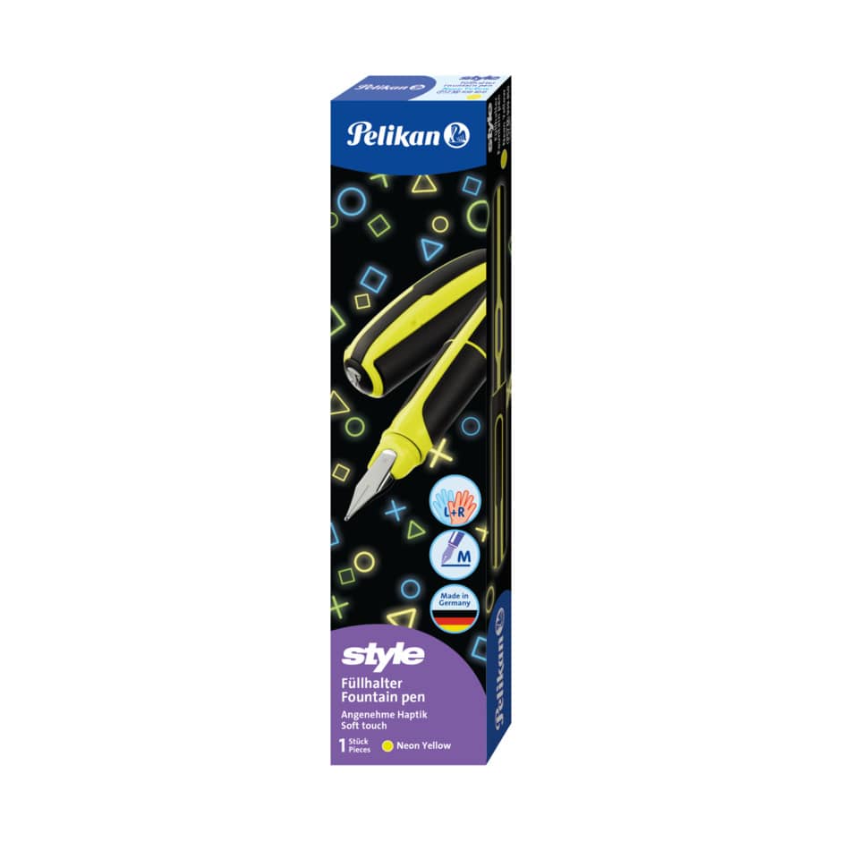 Füllhalter (Patronenfüllsystem) Jugendfüller Style P57. Material der Schreibfeder: Edelstahl. Tintenpatrone: Tintenpatrone 4001, blau. Material des Schaftes: aus weichem und hartem Material. Clip: Kunststoff, Neongrün. Ausführung der Feder: M. Farbe des Schaftes: Neongelb. Ausführung des Inhalts mit Packung: Faltschachtel mit 1 Schreibgerät.