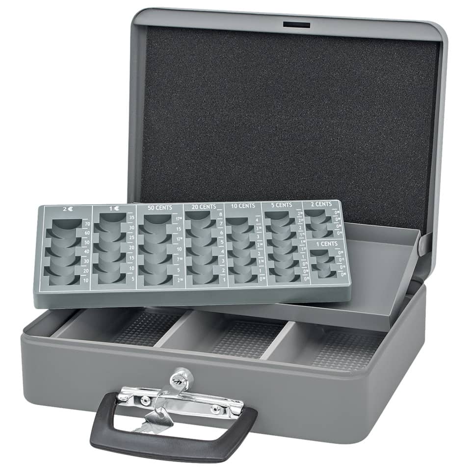 Stabile Kassette aus pulverbeschichtetem Stahlblech mit Koffertragegriff und 3-Fächereinsatz für Geldscheine. Der Hartgeldeinsatz gleitet beim Öffnen des Koffers automatisch nach hinten. Das Münzgeld wird durch den Schaumstoffeinsatz im Deckel beim Transport fixiert. Zylinder-Sicherheitsschloss mit 2 Schlüsseln. Fassungsvermögen Hartgeld: 137,60 Euro. Größe (B x T x H): 300 x 240 x 90 mm.