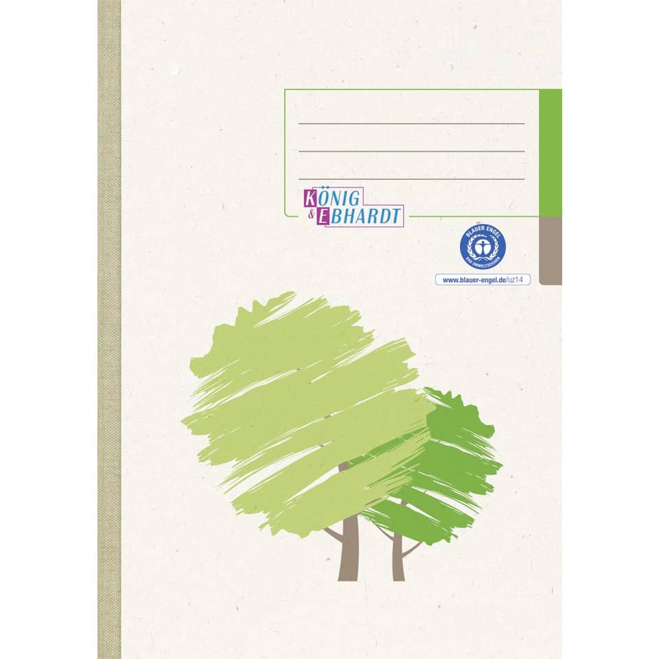 Geschäftsbuch. Ausführung: Klebebindung. Recycling-Papier. Ausführung Einband: UWS-Karton, Motivdruck „Grüner Baum“. Farbe des Rückens: dunkelgrün. Ausführung der Lineatur: liniert. Papierformat: A5. Größe (B x H): 148 x 210 mm. Anzahl der Blätter: 96 Blatt.