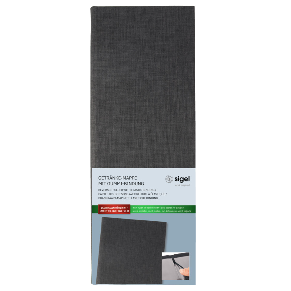 Getränkemappe mit Gummi-Bindung, anthrazit, passend für das Format 1/2 A4, aus hochwertigen Materialien: Polyurethan (PU), Polypropylen (PP). Man sagt in der Gastronomie: Das Auge isst und trinkt mit! Mit dieser Getränkemappe wird Ihr Getränkeangebot ansprechend präsentiert. Sie ist universell einsetzbar – zum Beispiel auch für Tages-, Brotzeit- oder Eiskarten – und langlebig dank strapazierfähigem Einband aus hochwertigem PU-Kunststoff (ohne Weichmacher). Zudem perfekt für den täglichen Einsatz, da leicht zu reinigen, sowie robust gegenüber Verschleiß, Kratzern und Abnutzung. Inkl. 2 transparenten Doppel-Hüllen für 8 Seiten. Praktisch: Transparenthüllen sind exakt passend für DIN A4, kein Zuschneiden nötig. Aber auch ohne Hülle nutzbar.