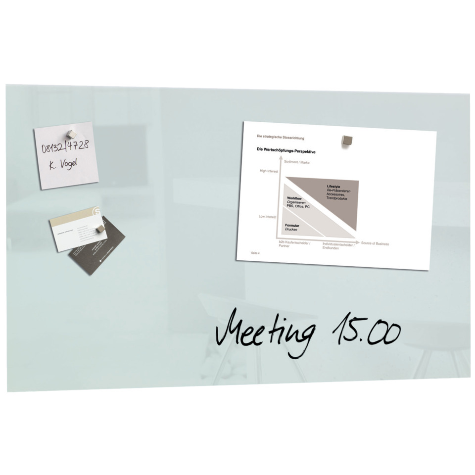 Das super-weiße Glas-Magnetboard Artverum im Format 78 x 48 cm ist ein multifunktionales Designobjekt mit purer Ästhetik, das für die perfekte Organisation steht: zum magnetischen Anhaften und immer wieder neu Beschriften. Herausragend in Design, Sicherheit und Qualität. Die Oberfläche ist aus hochglänzendem Tempered Glas und die rahmenlose Aufhängung lässt das Glas-Magnetboard frei vor der Wand schweben. So wird mehrfach international prämiertes Design zum Blickfang in Ihren Räumen. Als stylische Plan- oder Infotafel im Büro, im Besprechungszimmer oder auch zu Hause – magnetisch und immer wieder neu beschriftbar. Mit extra-starken Magneten haften Pläne, Grafiken, Notizen, Visitenkarten u. v. m. perfekt am Board. Glas-Magnetboards Artverum setzen Akzente, egal ob als Einzelstück im Hoch- und Querformat oder als Ensemble neben- oder untereinander an der Wand arrangiert. Die Boards sind nicht nur optisch, sondern auch in puncto Sicherheit ein Highlight. Besteht aus hochwertigem ESG-Sicherheitsglas (EN 12150-1). Die Aufhängung sorgt für sicheren Halt an der Wand. Extra-starke SuperDym-Magnete im Cube Design und Befestigungsmaterial inklusive.