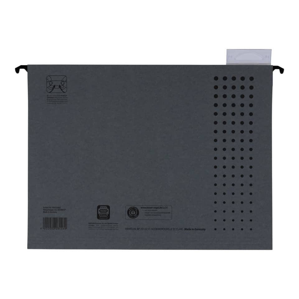 Exklusiver 230g/qm starker Canson® Karton verhindert das Ausreißen des Kartons bei intensivem Gebrauch. Für Lose-Blatt-Ablage, seitlich offen. Komfort-Sichtreiter mit aufklappbarer Rückwand und auswechselbarem Beschriftungsschildchen. Schlitzstanzung für Einhängeheftstreifen 27 592. Extrem steife Metallhängeschienen mit pulverbeschichteten Enden. Größe: 318 x 6 x 240 mm (B x T x H). Beschriftungsmöglichkeit mit ELBA print. Für A4. Umweltzeichen „Der Blaue Engel“ und „Paper by Nature“.