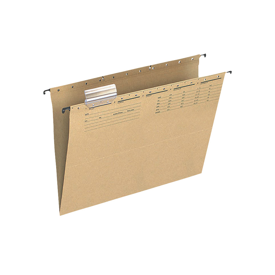 Hängemappe aus 230g/qm Natronkarton. Hängeschienen mit Vollsichtreiter und auswechselbaren Blanco-Schildchen. Für A4. Farbe naturbraun.