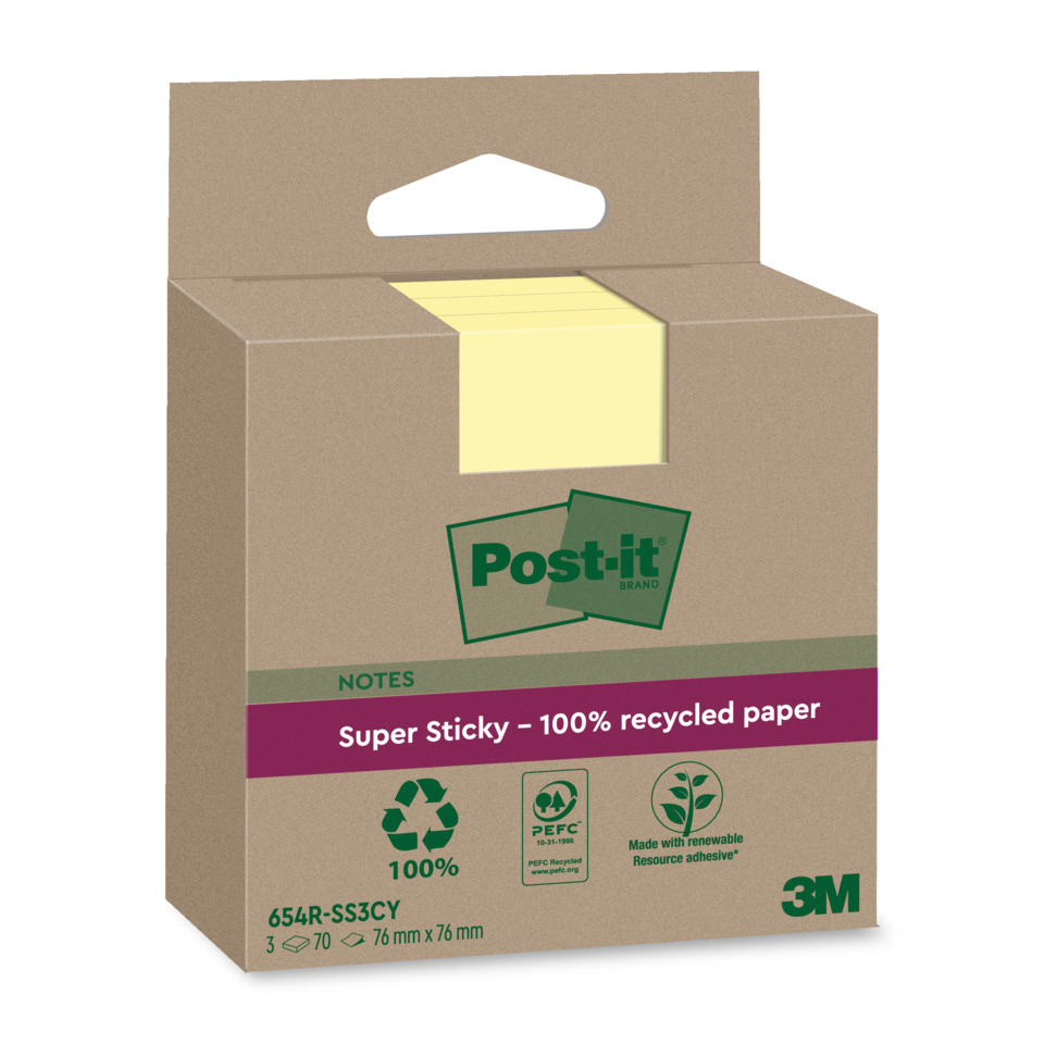Post-it® Super Sticky Recycling Notes. Bestehen zu 100 % aus recyceltem Papier und sind recycelbar, Verpackung aus recycelter Pappe. Anzahl der Blätter: 70 Blatt. Größe (B x H): 76 x 76 mm. Farbe: gelb. Inhalt der Packung: Kartonverpackung: 3 x 70 Blatt.