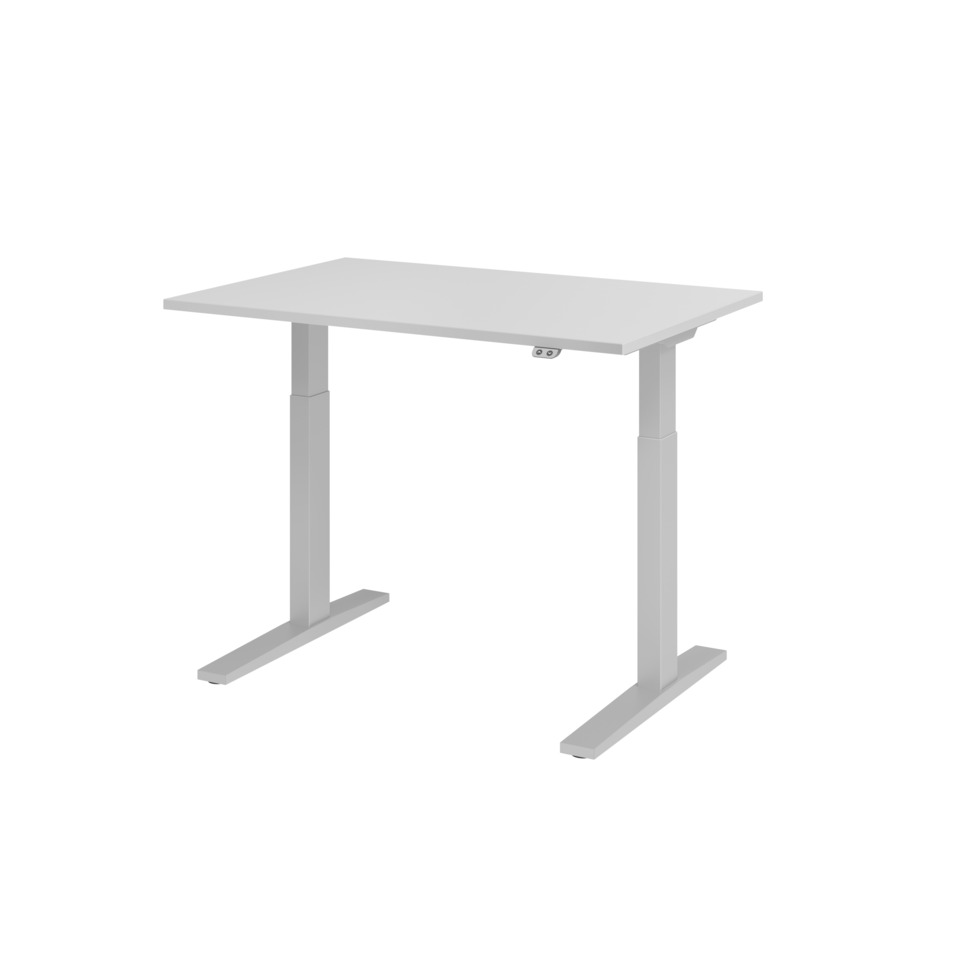 MIT MONTAGESERVICE, komplett montiert an die Kostenstelle geliefert, Verpackungen entsorgt. Schreibtisch elektrisch höhenverstellbar von 70 – 120 cm. Tischplattengröße (BxT): 120×80 cm mit äußerst stabilem T-Fuß-Gestell aus Stahlrohr 9,5x6cm. Fußgestellfarbe silber, Tischplattenfarbe grau. 1 Stecker mit Kabellänge 3 m. Elektr. Höheneinstellung mit up/down Tast-Schalter und Sanft-Anlauf/Snaft-Stopp mit Auffahrschutz. 1 Motor pro Tischbein. Belastbarkeit statisch 100 kg, dynamisch 60 kg. Verstellgeschwindigkeit 36 mm/s. Melaminharzbeschichtete Holz Tischplatte mit 2,5 cm Plattenstärke und stoßfesten ABS Kanten. Bruttogewicht 57 kg, Nettogewicht 54,45 kg.