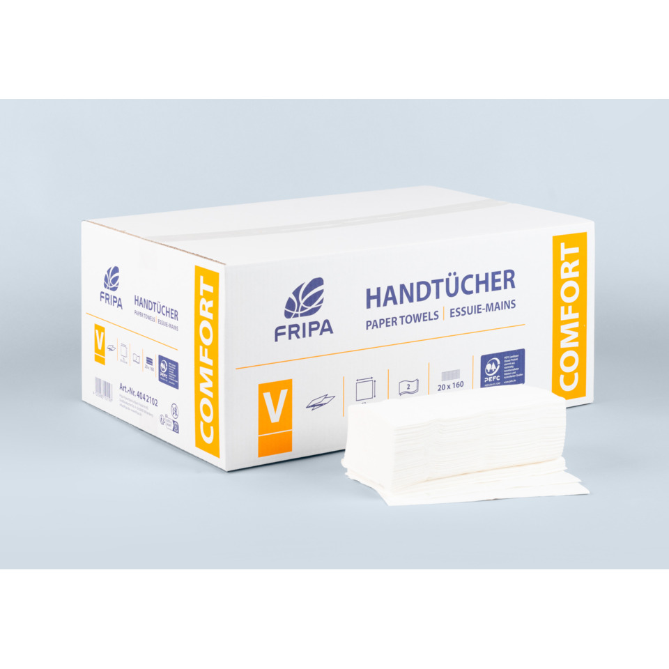 FRIPA Comfort-Luxuriöses Handtuchpapier im modernernen Multi-/ Interfalzformat, großes Blattformat, besonders hochwertig, saugfähig und reißfest, mit ansprechender Blumendekor-Prägung, bestehend aus 100 % chlorfrei gebleichtem Frischzellstoff aus verantwortungsvollen Quellen, PEFC-zertifiziert SGS-PEFC/COC-0977. Farbe: hochweiß. Packung mit 20 x 160 = 3200 Stück. Bei der Entnahme aus dem Spender entfaltet sich das Tuch automatisch.