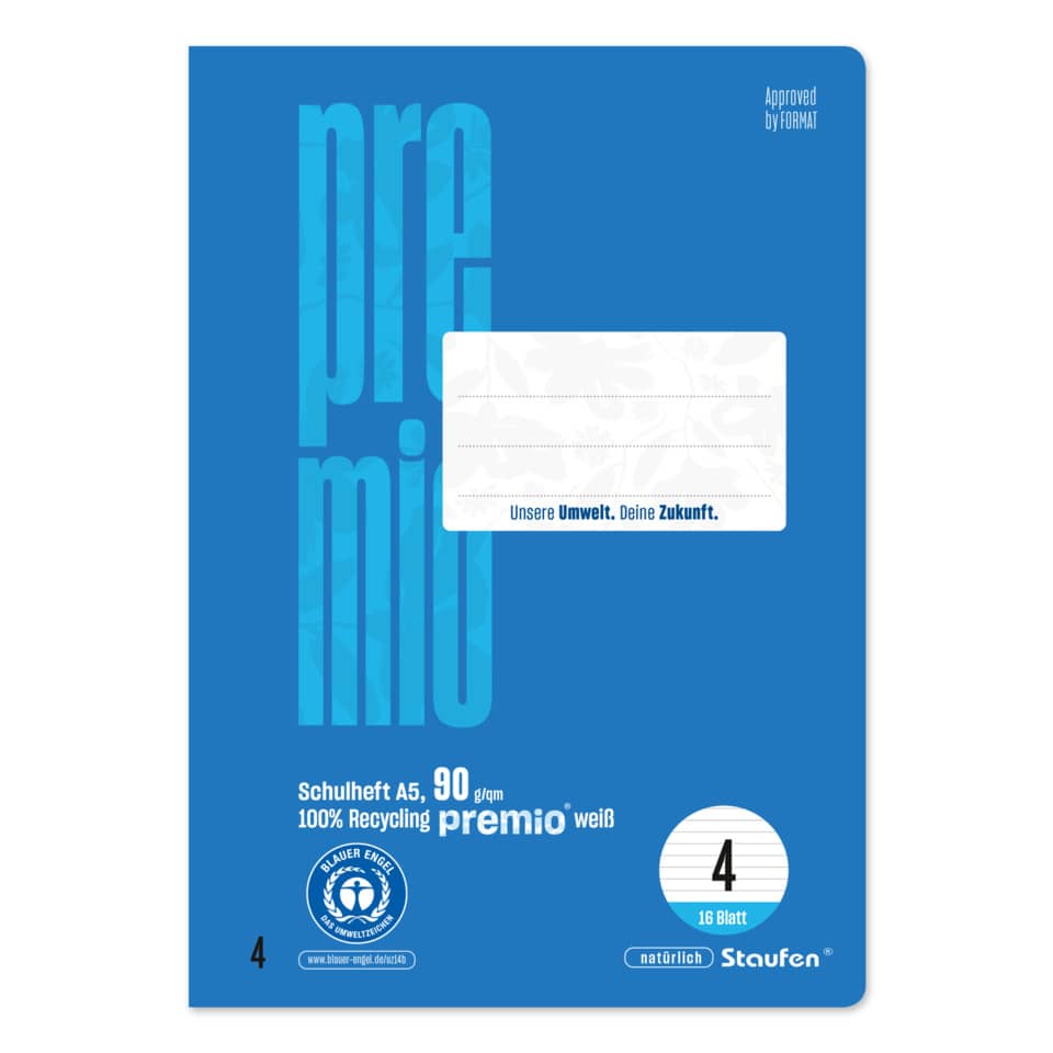 Schulheft Green. Ausführung Papier: 100% Recycling Pure Impact, 90 g/m². Ausstattung: Heftung am Rücken. Papierformat: DIN A5 = 14,8 cm x 21,0 cm. Lineatur/Lineatur-Nr.: liniert, 4. Anzahl der Blätter: 16 Blatt. Farbe des Einbandes: farbig mit Motiv. Blauer Engel.