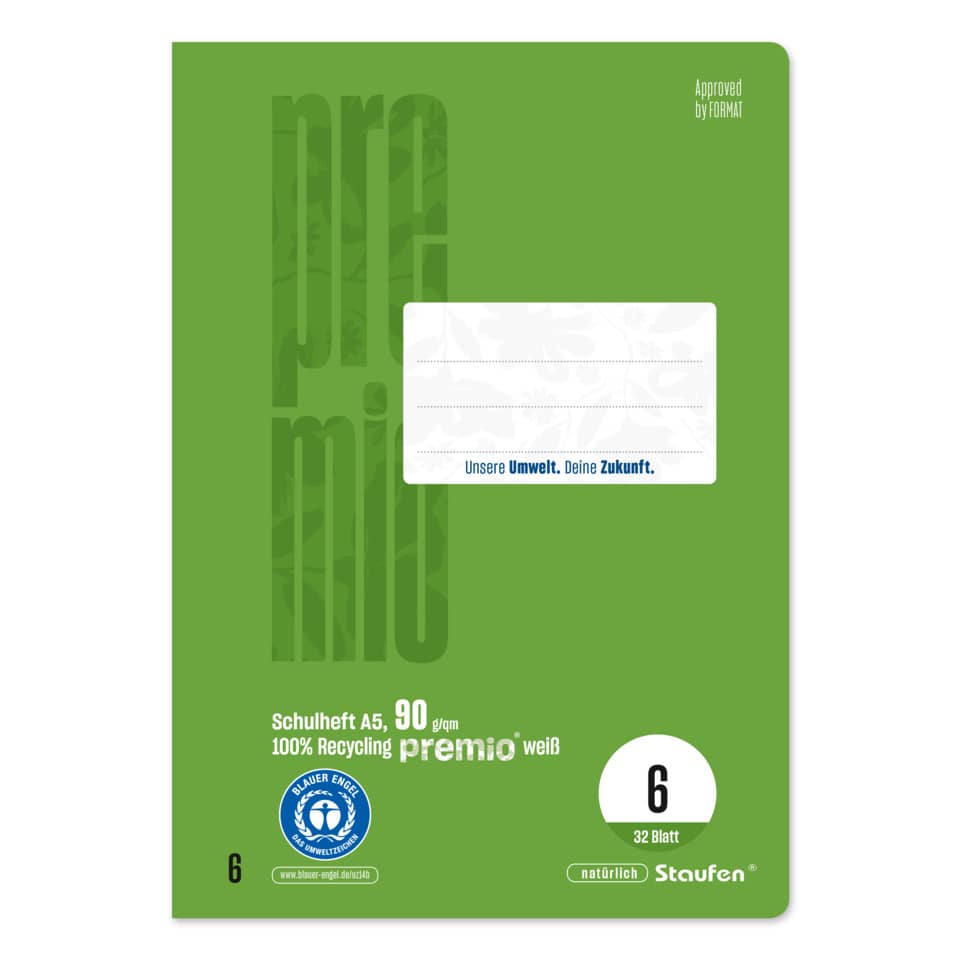 Qualität mit dem Umwelt-Extra! Das exklusive premio® Sortiment wird aus 100% recycletem Papier unter den strengen Auflagen des Blauen Engels und des EU Ecolabels hergestellt. Die erstklassige Beschaffenheit und das hochweiße 90 Gramm Papier sorgen für ein angenehmes Schreibgefühl und eine herausragende Opazität. Geschützt wird jedes Produkt durch Deckblätter bzw. Umschläge mit hoher Grammatur, im eleganten Design der modernen permio® Farbenwelt. premio® ist DER umweltfreundliche Begleiter in Schule und Büro.