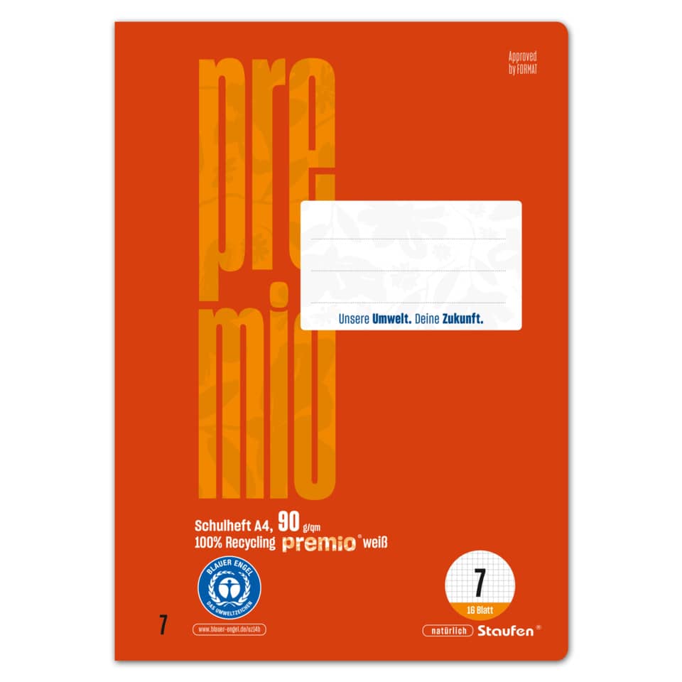 Schulheft Green. Ausführung Papier: 100% Recycling Pure Impact, 90 g/m². Ausstattung: Heftung am Rücken. Papierformat: DIN A4 = 21,0 cm x 29,7 cm. Lineatur/Lineatur-Nr.: kariert 7mm, 7. Anzahl der Blätter: 16 Blatt. Farbe des Einbandes: farbig mit Motiv. Blauer Engel.