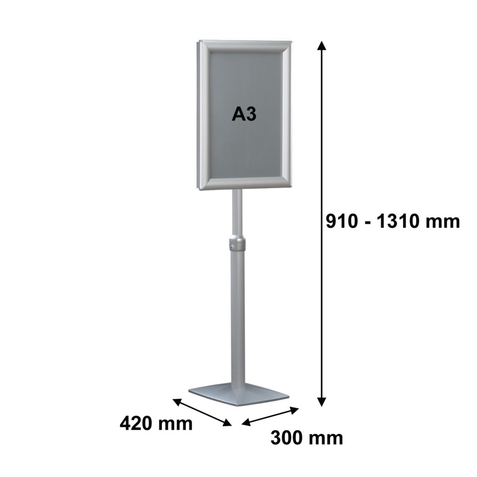 Infodisplay Universal. Material und Farbe des Rahmens: Aluminium, silber. Ausführung der Tür: Bilderwechselrahmen mit Klemmprofiltechnik. Typbezeichnung der Glasart: Antireflex-Schutzfolie mit UV-Filter. Für DIN A3. Befestigung: Einbeinstativ, Kunststofffuß mit Eisengewicht. Größe (B x H x T): 30 x 131 x 42 cm. Farbe/Oberfläche: transparent. Masse (Gewicht): 5 kg. Art der Verpackung und Inhalt: Karton mit 1 Stück.