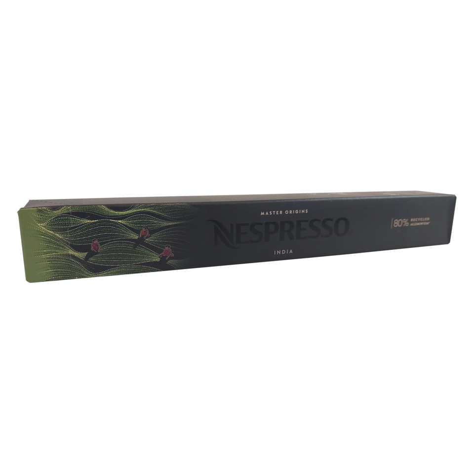 Nespresso ORIGINAL Kaffeekapseln India. Der Arabica wird leicht geröstet, damit seine feinen Aromen bestehen bleiben. Der Robusta hingegen wird kräftig geröstet, um seine Intensität zu betonen und die Entwicklung eines ausgeprägten Körpers zu ermöglichen. Eine sehr feine Mahlung unterstreicht den Körper und veredelt den Geschmack. Kakao- und Gewürznoten mit einem Bouquet, das an Nelken, Pfeffer und Muskatnuss erinnert. Intensität: 11. Packung mit 10 Kapseln Nettogewicht ( 10 Kapseln ) 55g.