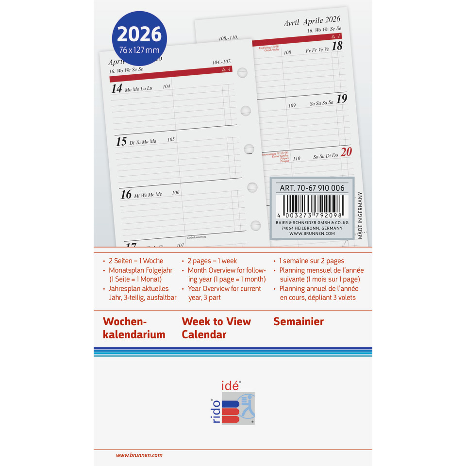 Das Wochenkalendarium Timing 3 2026 im handlichen A7-Format (76 x 127 mm) ist ideal für alle, die auch unterwegs gut organisiert bleiben möchten. Mit 128 Seiten bietet es eine klare Wochenübersicht eine Woche verteilt auf zwei Seiten und schafft so ausreichend Platz für Termine und Notizen. Die Einlagen sind viersprachig gehalten (Deutsch, Englisch, Französisch, Italienisch) und eignen sich damit auch hervorragend für den internationalen Gebrauch. Zusätzlich enthält das Kalendarium eine Jahresübersicht für 2026 und 2027, einen ausfaltbaren 3-teiligen Jahresplan für 2026, einen Monatsplan für 2027 sowie drei Seiten mit nützlichen Informationen. Die praktische 6-fach-Lochung ermöglicht die einfache Ablage in allen gängigen Zeitplanern.