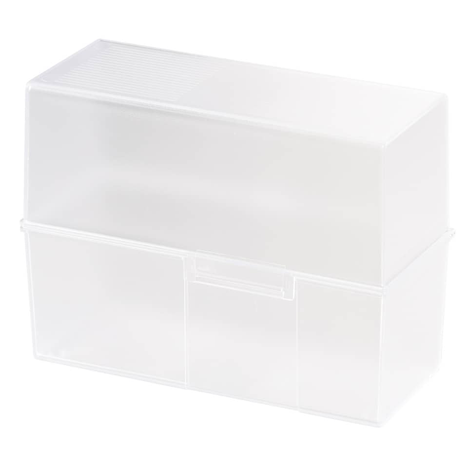 Karteibox DIN A5 quer, für max. 500 Karten. Der ideale Ordnungshelfer für Büro und unterwegs. Qualitativ hochwertige Ausführung mit Stahlscharnier sowie Schnappverschluss. Der Deckel lässt sich komplett umklappen und fungiert auch als zusätzlicher Karteitrog. Fassungsvermögen: von 330 Karten (190g/m²) bis max. 500 Karten (100g/m²). Lieferung ohne Inhalt. Verwendung für Kartenformat: DIN A5 quer. Zubehör optional: Register A-Z DIN A5, quer (Art.-Nr. 985). Außenmaße (B x T x H): 228 x 102 x 171 mm. Material: hochwertiger Kunststoff, Polystyrol (PS). Farbe: transluzent-klar.