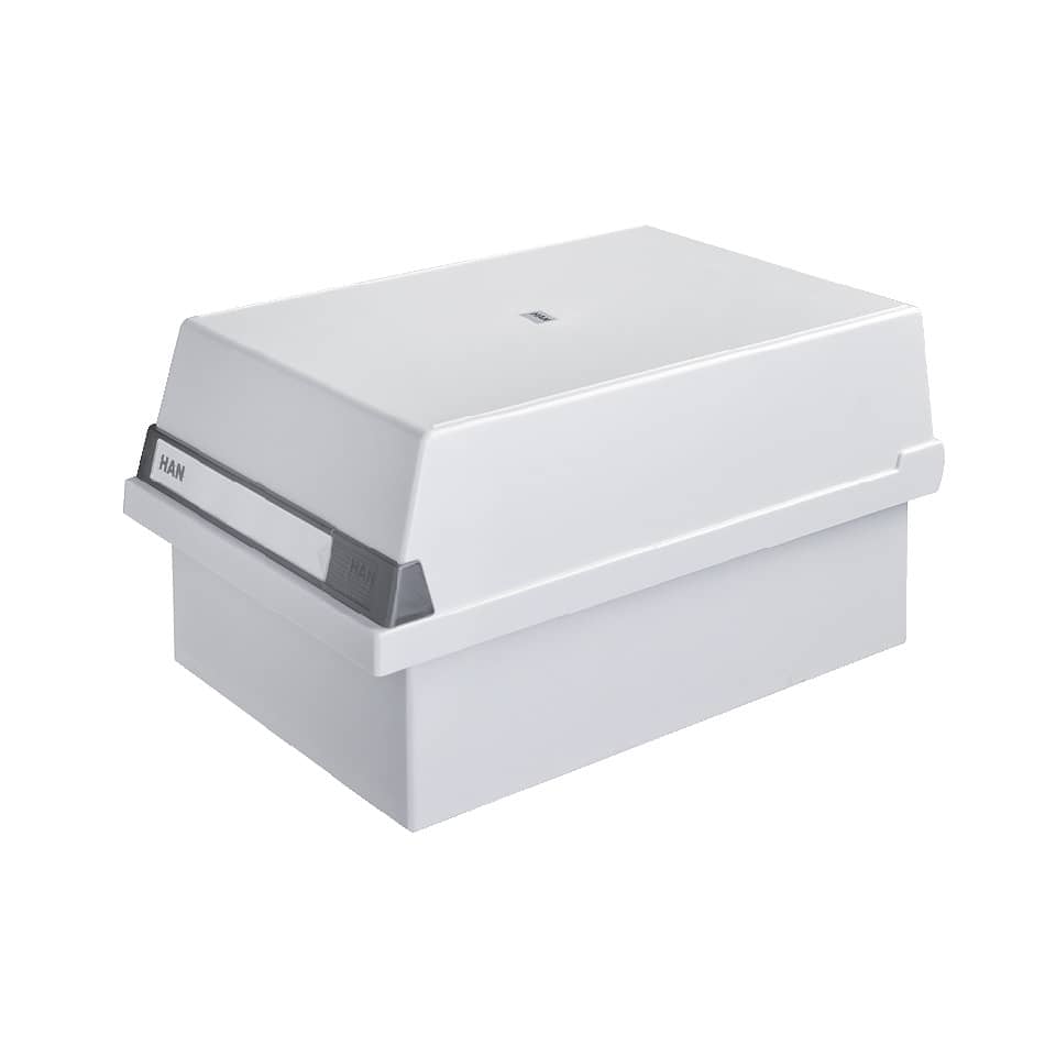 Karteikasten für ca. 1.300 Karten. Werkstoff: hochwertiger, schwermetallfreier Kunststoff. Das Unterteil kann platzsparend in den abnehmbaren Deckel gestellt werden, optimales Beschriftungsfeld, möbelschonende Kautschukfüßchen, inkl. 2 Stützplatten mit verschiebbarem Sichtreiter. Verwendung für Kartenformat:: A5 quer. Größe (B x H x T): 235 x 190 x 360 mm. Farbe: lichtgrau